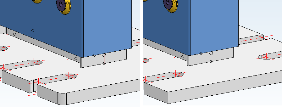 À l'aide de cette variante de design, vous pouvez ajouter en quelques clics à un profilé de série une jonction de platine de base/platine de recouvrement (les platines d'about) accompagné de tous les éléments individuels et usinages correspondants.