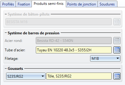 Dans cet onglet, vous sélectionnez les produits semi-finis pour le tube de force et les goussets. Les champs qui seront actifs dépendent du type d'exécution sélectionné dans l'onglet Fixation.