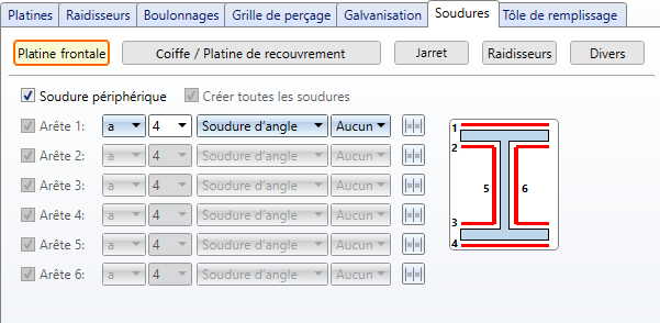 Cliquez sur le bouton de votre choix, en haut de l'onglet, et spécifiez en cochant les cases correspondantes sur quelles arêtes doivent être créées les soudures. Les paramètres pour les raidisseurs restent toujours disponibles.