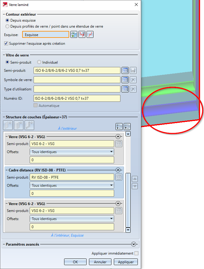 Lorsque vous construisez un verre laminé à partir d'une structure de couche individuelle, en sélectionnant une couche dans la fenêtre de dialogue Verre laminé, la couche correspondante sur la scène sera également mise en évidence par une couleur.