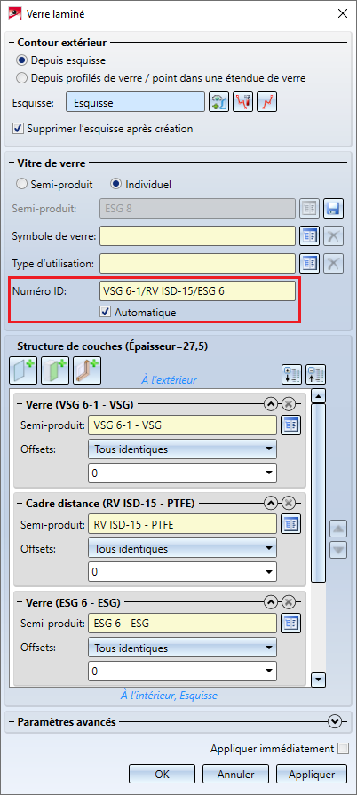 Il est désormais possible, à la création individuelle d'une vitre de verre laminé de générer automatiquement un Numéro ID à partir des couches insérées. Pour cela, une nouvelle case Automatique est présente dans la fenêtre de dialogue Verre laminé en-dessous de l'option Numéro ID. Si cette case est cochée, le Numéro ID sera généré automatiquement par la combinaison des désignations de chacune des couches séparées par un signe de séparation.