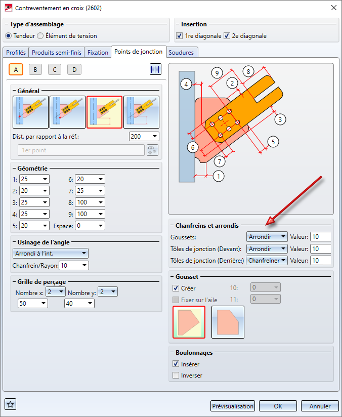Dans le cadre d'un Contreventement en croix (2601), il est désormais possible dans l'onglet Points de jonction de définir un décalage pour la grille de perçage et ainsi influencer sa position.