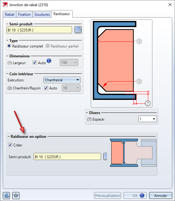 Pour la Jonction de rabat (2310) avec raidisseur, il est possible d'insérer en option un deuxième raidisseur. L'onglet Raidisseur a été complété à cette fin.