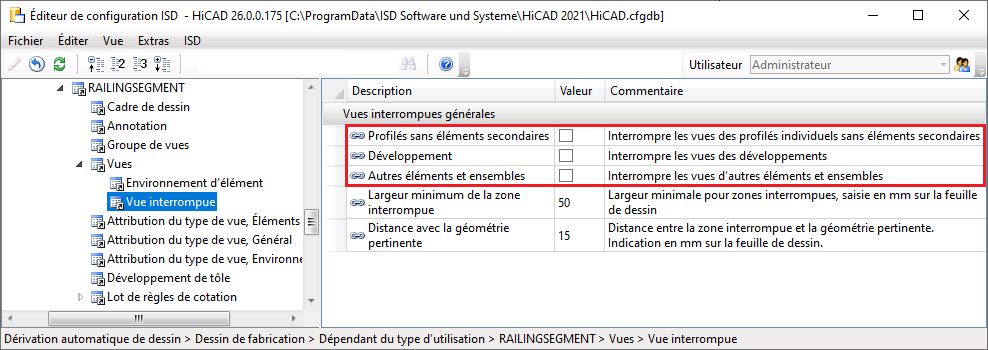 La configuration RAILINGSEGMENT pour les garde-corps, dans le cadre de la dérivation de dessin, a été modifiée. Désormais, les vues ne seront ici pas représentées automatiquement de façon interrompue. Pour cela, dans le Gestionnaire de Configurations, sous