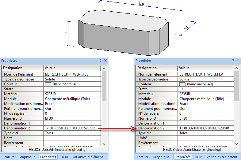 Pour les tôles du module de la Charpente métallique, l'attribut Dénomination 2 était paramétré de sorte que la largeur apparaît avant la longueur. À partir de HiCAD 2021 SP1, ce n'est plus le cas. Comme pour les tôles pliées, , c'est la longueur qui apparaît avant la largeur, en d'autres termes