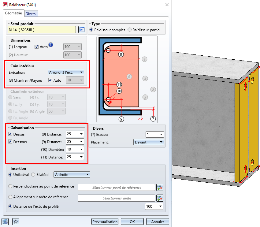 à la création de raidisseur, est sélectionné sous Coin intérieur comme exécution Arrondi à l'extérieur, il sera alors possible à partir du SP1 de spécifier si le raidisseur devra être muni de trous pour la galvanisation.