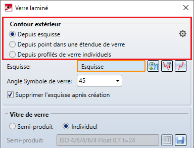 Dans la fenêtre de dialogue Verre laminé, vous pouvez désormais sélectionner le contour extérieur directement par trois cases à cocher Depuis esquisse, Depuis point dans une étendue de verre et Depuis profilés de verre individuels. Les mêmes fonctions correspondant à ces cases étaient déjà disponibles, mais en partie uniquement accessibles via le menu contextuel. Vous pouvez maintenant les sélectionner directement dans la fenêtre de dialogue.