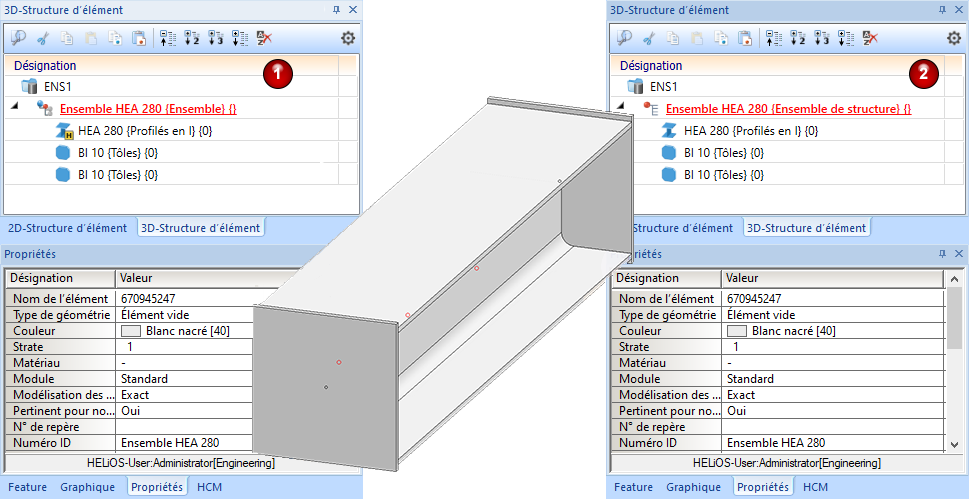 L'illustration montre une scène de la Charpente métallique : à gauche comme ensemble "normal" (1) et à droite comme ensemble de structure.