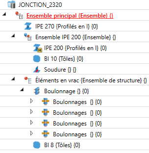 À la création de jonctions de la Charpente métallique entre deux profilés, un ensemble pertinent pour la nomenclature sera généré pour chacun des profilés , structuré selon les directives de la DSTV. Cela signifie qu'un ensemble comprend chacun le profilé comme élément principal d'ensemble et, au même niveau, les composants de la jonctions appartenant à chaque profilé. En fonction de la situation de votre scène, il peut arriver, dans de rare cas, que la structuration selon la DSTV ne peut être exécutée. Cela peut être évité par l'utilisation d'ensembles de structure.