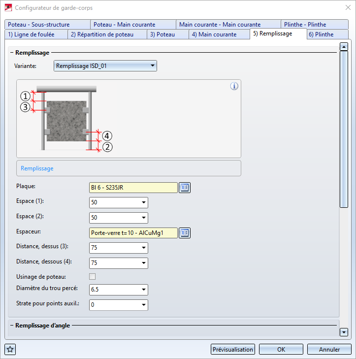 Lors de l'insertion de poteaux, la 1/2 épaisseur de poteau dans les directions X et Y ne représente aucune valeur de saisie du configurateur de garde-corps (i_ex..., i_ey...) ; au lieu de cela, les valeurs doivent être créées par la variante de poteau. Par conséquent, vous ne devez pas utiliser dans la variante les variables i_ex et i_ey, mais ex et ey. Ces valeurs seront ensuite fournies au configurateur de garde-corps, dans les variables i_ex et i_ey du remplissage.