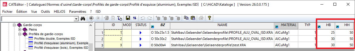 • Le tableau du catalogue correspondant, c'est-à-dire le tableau à partir duquel le profilé est chargé, doit (comme les exemples de tableaux pour les profilés de garde-corps sous Normes d'usine > Garde-corps > Profilés de garde-corps) contenir les colonnes HH et HB.