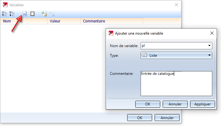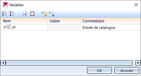 Pour créer une variable de ce genre, choisissez Ajouter une nouvelle variable dans la fenêtre de dialogue des Variables (Standard 3D > Outils > Attr. > Variables d'élément), saisissez le nom de la variable, par exemple pl et choisissez comme type de variable Liste. En outre, vous pouvez saisir ici un Commentaire, par exemple Entrée de catalogue. Lorsque vous confirmez avec OK, la variable sera insérée.
