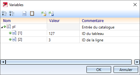 Par un clic droit de la souris sur la ligne contenant la nouvelle variable, vous pouvez Ajouter une nouvelle variable. Il n'est pas nécessaire de spécifier un nom ici, car il sera déterminé automatiquement. Choisissez comme type de variable Nombre et comme valeur l'ID du tableau, par exemple 127 pour le tableau Produits semi-finis > Tôles > Tôle. Ici aussi, vous pouvez laisser un commentaire, par exemple ID du tableau. Après avoir confirmé par OK, la sous-variable sera créée, un nombre consécutif entre crochets sera utilisé automatiquement comme nom, par exemple [1]. Procédez de la même manière pour créer la variable pour l'ID de la ligne.
