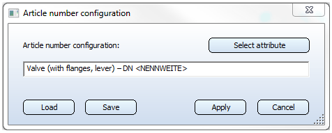 This button enables the configuration of the attribute value for the Article number attribute. (when performing a part data synchronisation with the HELiOS Database, the content of this attribute will be assigned to the HELiOS part attribute BESTELLVERMERK (=ORDER_NOTE).