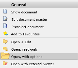 Open, with options function, which you can execute via the context menu of the right mouse button on document entries in result lists of the HELiOS search or in the workspace: