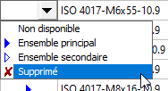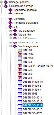 Admettons encore que vous ne souhaitez pas que la vis M6x55 puisse être sélectionnée dans HiCAD. L'éditeur de catalogue vous permet de bloquer des pièces standardisées qui ne doivent pas être utilisées, plutôt que de les supprimer. Cela s'effectue simplement par un changement de son statut.