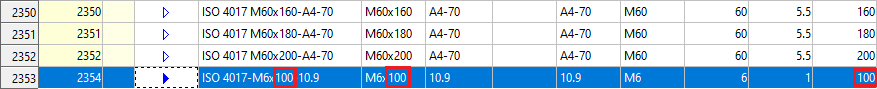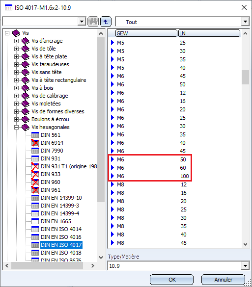 Supposons que vous avez besoin d'une vis hexagonale selon DIN EN ISO 4017 aux dimensions M 6x100 (Matériau 10.9). Si celle-ci est absente du tableau, n'est pas la faute d'un bug, mais du fait que ISD s'est limité à certaines normes. À l'aide de l'éditeur de catalogue cependant, vous n'aurez aucun problème pour compléter le tableau des vis ayant d'autres dimensions.