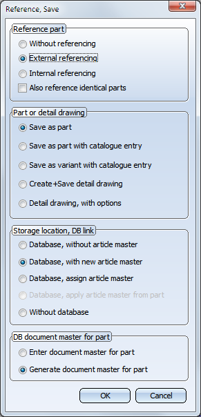 An externally referenced part can only be saved as a part or a variant if it has previously been saved as a referenced part (External referencing, Save as part). Then, call the Reference part, Save, Detail drawing function for this part again and select the option Save as part/variant with catalogue entry. |