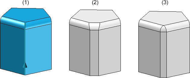 (1) Élément original et arête sélectionnée, (2) Chanfrein avec Longueur, (3) Chanfrein avec Rolling Ball |