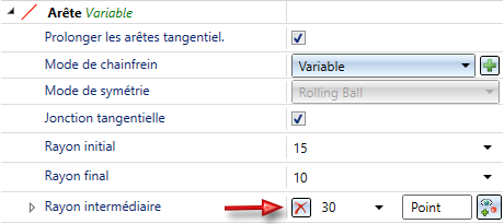 Les entrées pour les rayons intermédiaires des chanfreins variables peuvent être supprimées par un clic sur le symbole