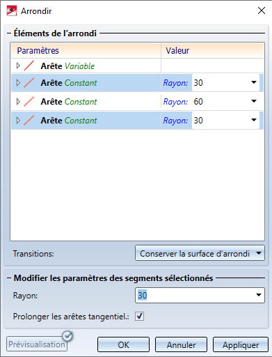 - Pour les arêtes, à côté du type d'élément est indiqué le type d'arrondi : Constant ou Variable.