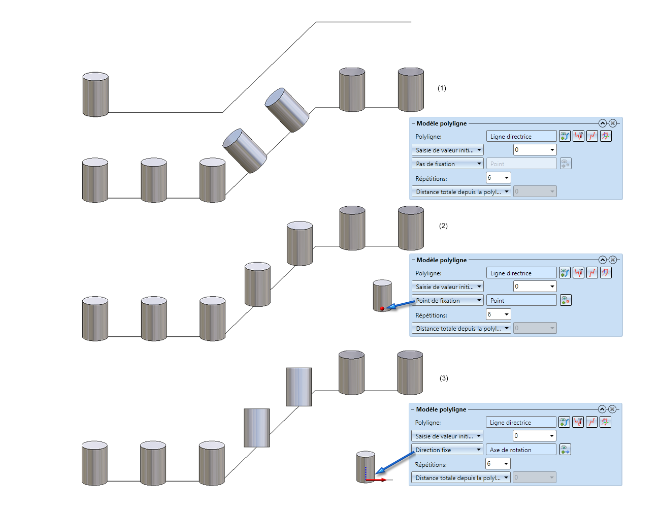 Dans cet exemple, les répétitions d'un cylindre sont créées selon le modèle polyligne. La polyligne illustrée est une esquisse 3D. Différents paramètres ont été utilisés.