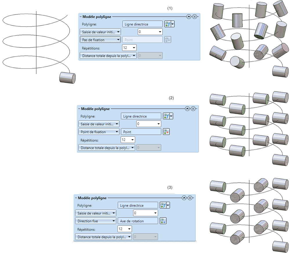 Dans cet exemple, les répétitions d'un cylindre sont créées selon le modèle polyligne. La polyligne en illustration est une spirale. Différents paramètres ont été utilisés.