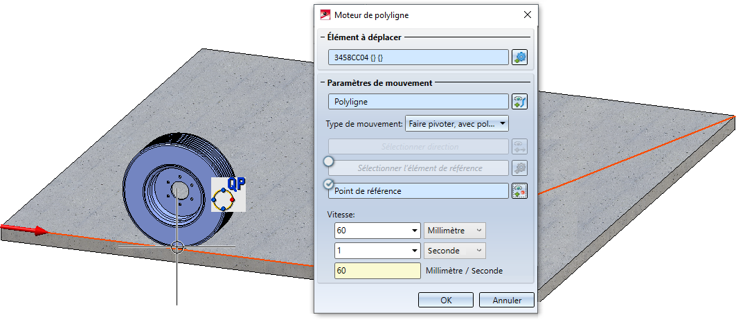 (avec comme élément à déplacer la roue, la polyligne est l'esquisse surlignée en bleu, Direction : Polyligne, Type de mouvement : Faire pivoter, avec polyligne, sans point de référence, Vitesse : 60 mm/sec).