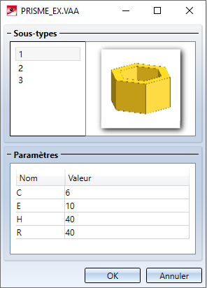 et sélectionnez la variante créée ci-dessus PrismeEx.vaa, la géométrie sera alors échangée dans la variante et la nouvelle variable "r1" ajoutée dans tous codes de données existants de la variante. Tous les autres sous-types sont conservés. Si on insère maintenant la variante PrismeEx.vaa, les sous-types reçoivent alors en plus la variable "r1".