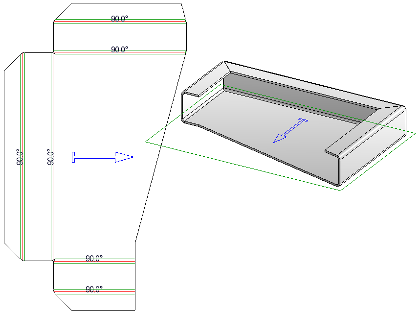 À la création d'une projection développée d'une tôle, cette direction peut être utilisée optionnellement pour l'orientation du développement. C'est alors que le développement sera créé sur le côté sur lequel la flèche est située et automatiquement aligné horizontalement sur le symbole de direction.