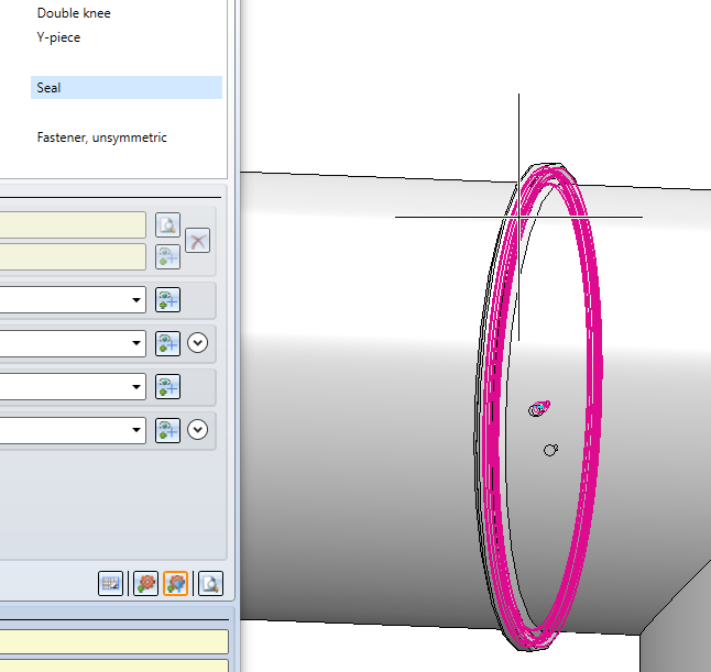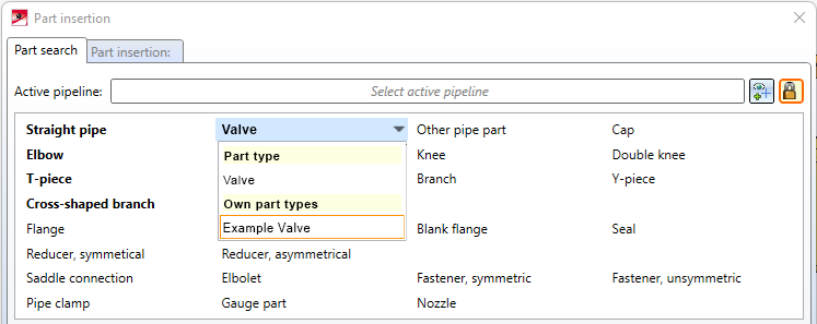 First select the part type that is to be installed. If you have defined your own part types, e.g. valves, an arrow symbol is displayed next to the corresponding part type. Click on the symbol to display a list box with the corresponding part types.