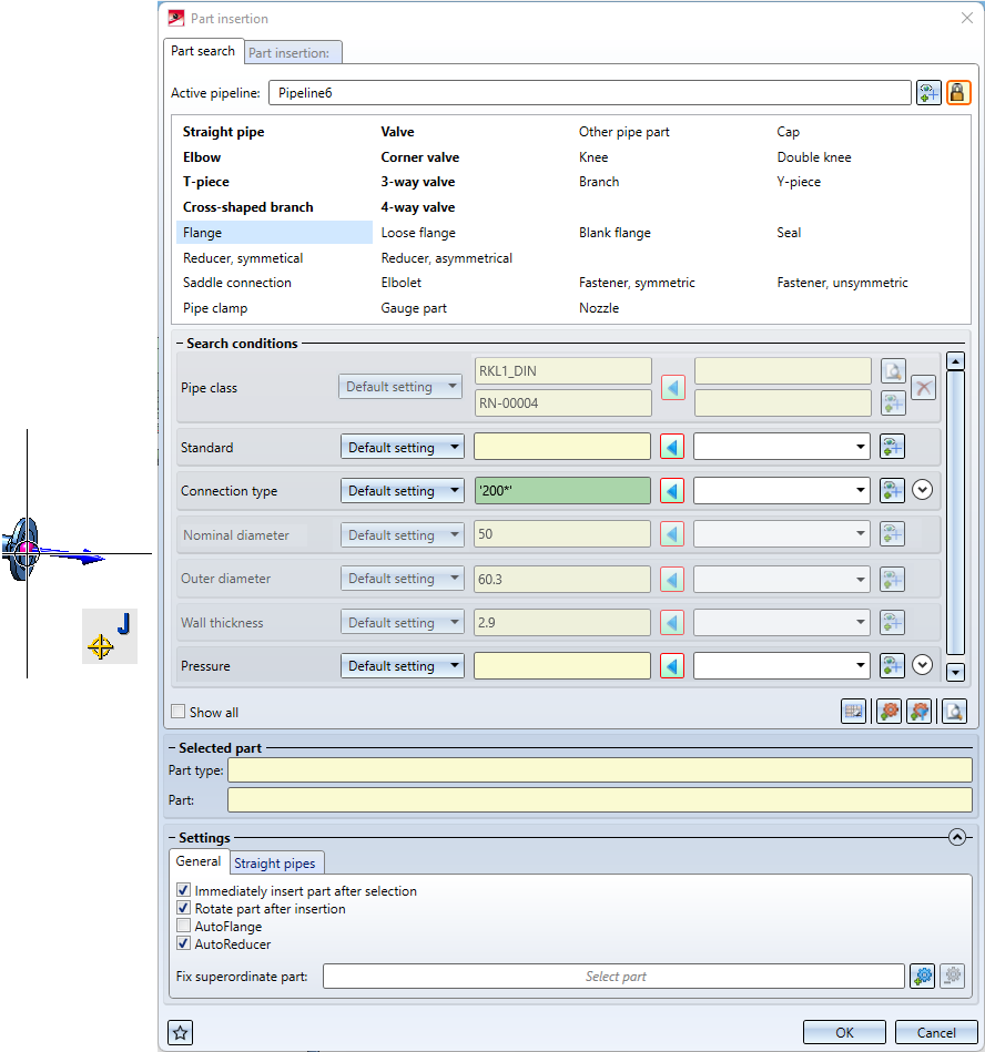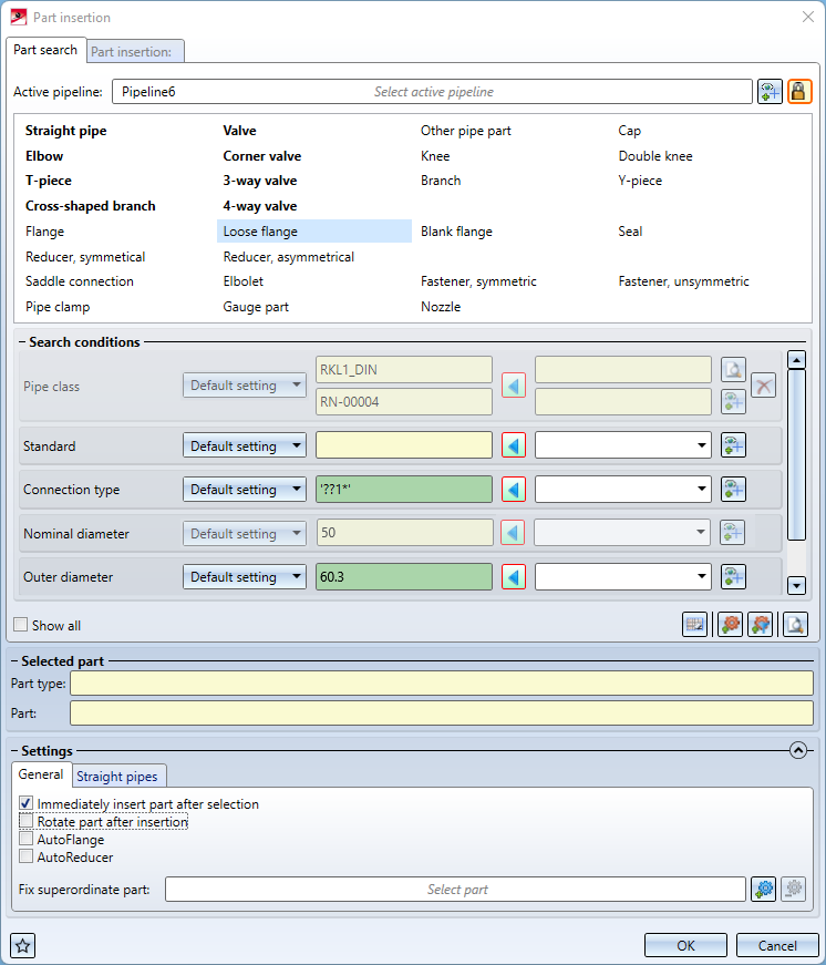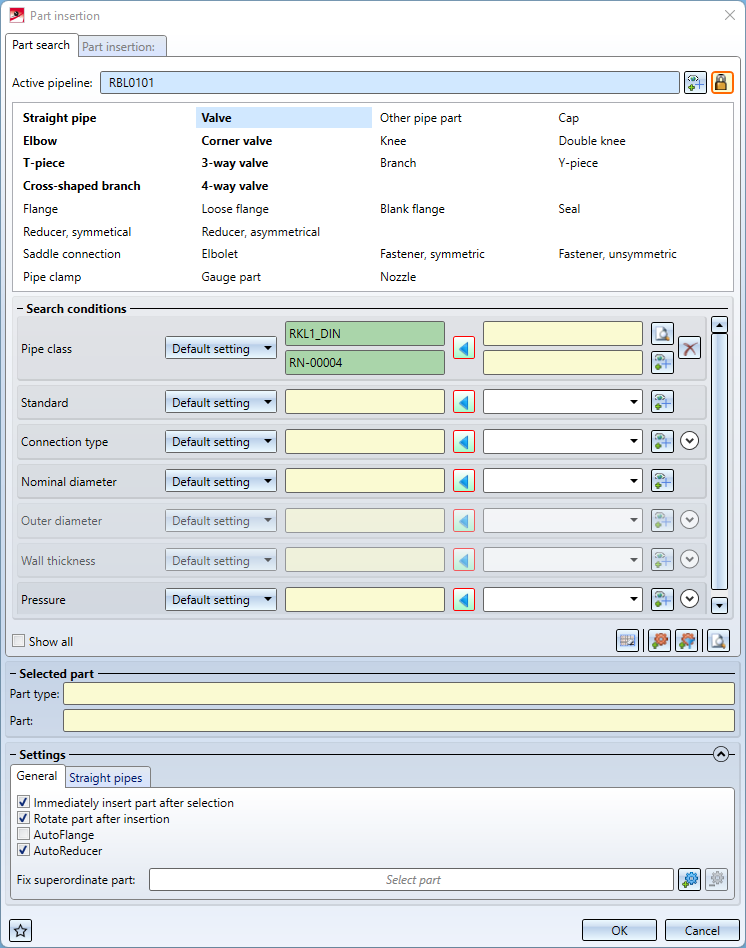 Pipe parts are parts that can be part of a pipeline. They can be aligned and positioned using guidelines. The dialogue shown is displayed for the insertion of pipe parts. In this dialogue window you have full control over which search criteria are used to search for a part.
