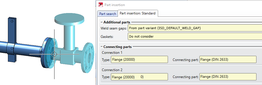 During insertion, an attempt is made to automatically connect a part with the most suitable connection. For example, when connecting a flange to a fitting with a flange connection, the part is automatically rotated so that the flange connections meet. The context menu also contains other settings that can be used to control the insertion, some of which also have shortcuts: