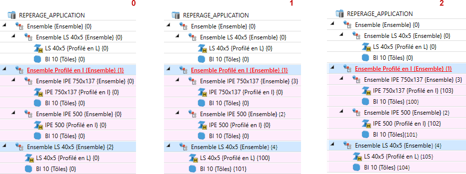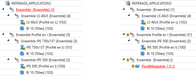 L'illustration de gauche montre la scène à l'origine avec des différents éléments et ensembles déjà repérés (tous les éléments sont pertinents pour la nomenclature. Favori Charpente métallique). Dans l'illustration de droite, la scène d'origine a été modifiée par l'insertion d'une tôle sur le profilé IPE 500. Par ailleurs, l'ensemble LS 40x5 s'est vu subordonner un autre ensemble comme élément secondaire. La tôle et le nouvel ensemble ne sont pas encore repérés.
