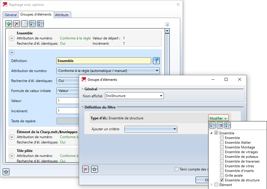 * Il est aussi possible ici de modifier le groupe d'éléments Ensemble de sorte que sous Modifier le filtre d'élément l' Ensemble de structure soit décoché. Il sera alors inutile de modifier l'ordre des groupes d'éléments.