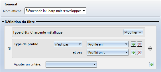 * Il est aussi possible ici de modifier le groupe d'éléments Élément de la Charpente métallique/Enveloppes de bâtiment, de sorte que sous Modifier le filtre d'élément les profilés en I et en L sont exclus. Il est pour cela nécessaire d'ajouter un critère. Il sera alors inutile de modifier l'ordre des groupes d'éléments.