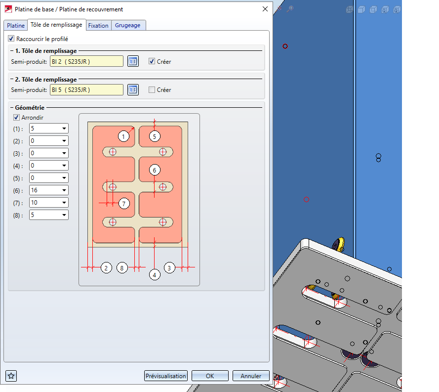 Sous Géométrie, vous pouvez, pour les tôles de remplissage comme pour la Platine, également en cochant la case Arrondir déterminer un arrondi. Le rayon est la valeur (1) de la Géométrie.