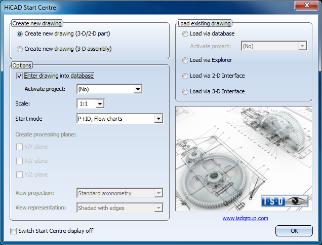 The P+ID Module can be called – if not deactivated - via the HiCAD Start Centre, and select the Flow charts, P+ID option as Start mode.