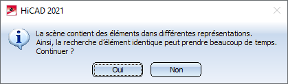 Si une scène contient des éléments dans des représentations différentes, par exemple des escaliers/garde-corps insérés de façon simplifiée via les configurateurs (macros) et en plus des objets de Charpente métallique avec le type de représentation exacte, un recalcul du type de représentation aura alors lieu lors du repérage (positionnement) de la scène dans le cadre d'une recherche d'élément identique. HiCAD vous affiche alors le message suivant :