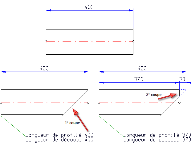 Lors du troncage des profilés, la valeur attribuée à l'attribut d'élément Longueur n'est pas la longueur de la découpe, mais la longueur totale du profilé coupé. Si un profilé est tronqué deux fois, la longueur calculée est alors la plus petite des deux longueurs totales individuelles, après exécution de la coupe. La longueur du profilé et la longueur coupée sont donc identiques.