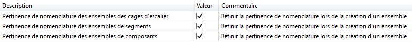 La pertinence pour la nomenclature des ensembles à générer par le configurateur d'escalier peut être établie dans l'éditeur de configuration (isdconfigeditor.exe) via Charpente métallique > Produits > Escalier. Cette pertinence est séparée entre :