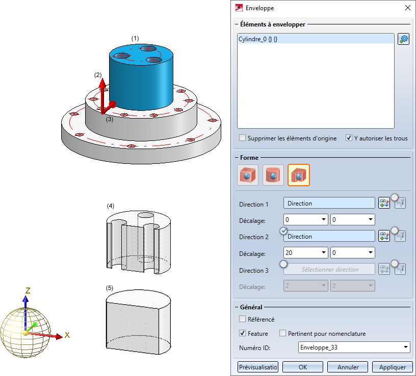 Si vous sélectionnez comme forme Translation, la case Y autoriser les trous est alors également présente. En cochant cette case, il est possible de prendre en compte les trous (par exemple, les perçages) dans l'original comme dans l'enveloppe.