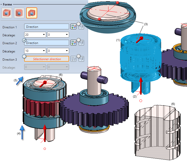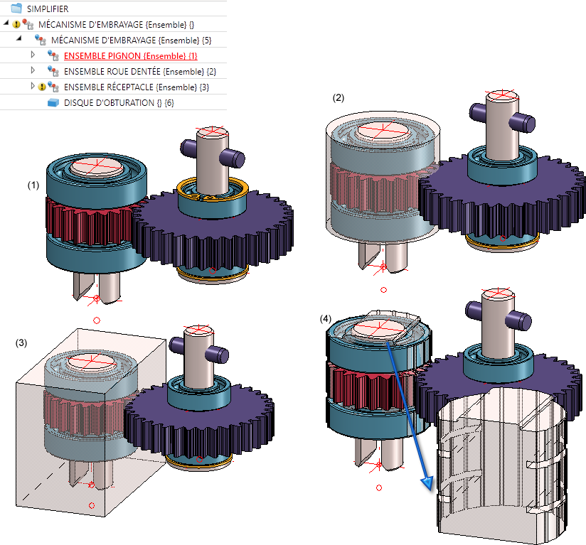 Les différentes options vous seront expliquées à l'aide de l'illustration suivante. On souhaite ici envelopper l'ensemble de gauche (Ensemble pignon).