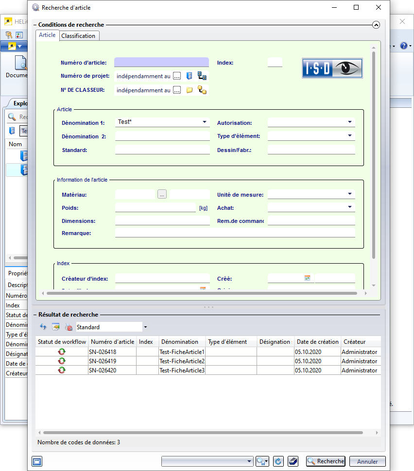 Démarrez tout d'abord le bureau HELiOS et créez, en entrant des critères de recherche appropriés via la recherche combinée d'articles, une liste de résultat qui contient des fiches d'article que vous voulez utiliser pour la variante d'élément. Laissez cette fenêtre ouverte, elle sera encore nécessaire par la suite.