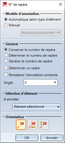 Cette fonction permet d'annoter rapidement sans les possibilités de paramètres de la fonction Annotation d'élément. Par la même occasion, un numéro de repère (aussi dit numéro de position) sera attribué à l'élément. Le numéro de repère sera affiché entre accolades dans la structure d'élément de l'ICN après le nom de l'élément, par exemple {5}.