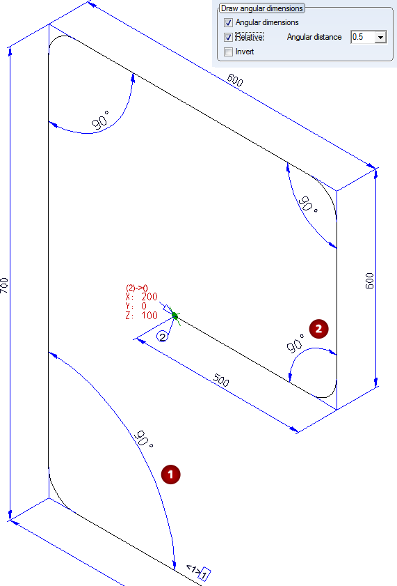 You determine the orientation of the angular dimensions by activating or deactivating this checkbox, i.e. you determine whether the angle dimensions are to be drawn between their respective legs, or the opposite counter-angles are to be dimensioned. If the checkbox is active, the opposite counter-angles will be dimensioned.