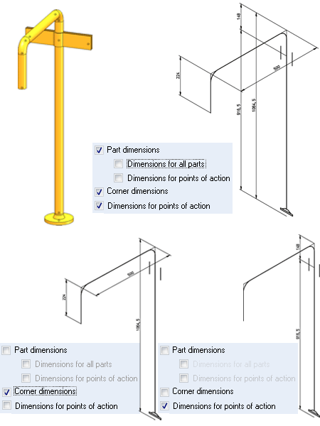 If you want to dimension the arcs of bent pipes to facilitate processing on bending machines, activate/deactivate the desired checkboxes in the Draw angular dimensions area at the bottom left.