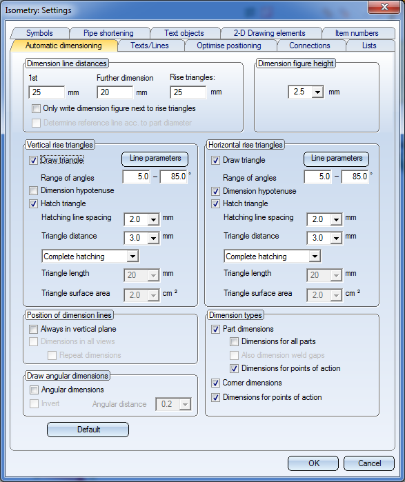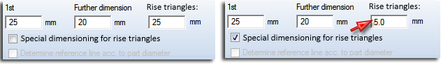 If the Only write dimension figure next to rise triangles checkbox is deactivated, linear dimensions will be used for the rise triangles, but with the dimension distance entered in the Rise triangles checkbox. If the checkbox is deactivated, and the same dimension distance is set for Rise triangles and 1st dimension line, the behaviour will be the same as in older HiCAD versions (before HiCAD 2100.0).