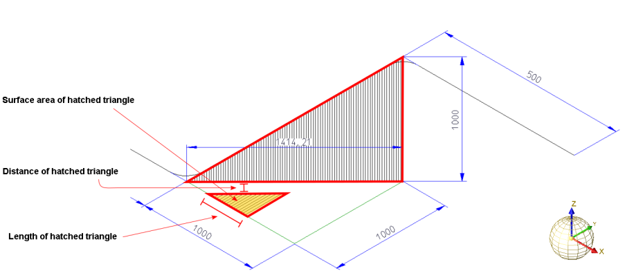 If you select the Triangle surface area option for the hatching, the length of the corresponding hatching will be calculated by HiCAD accordingly. The effect of this setting is that an acute angle between hypotenuse and start cathetus leads to a longer hatching distance that an obtuse angle. Visually, the hatching in both rise triangles are equally intense. The result is a significantly enhanced impression of the three-dimensional route of the pipeline.