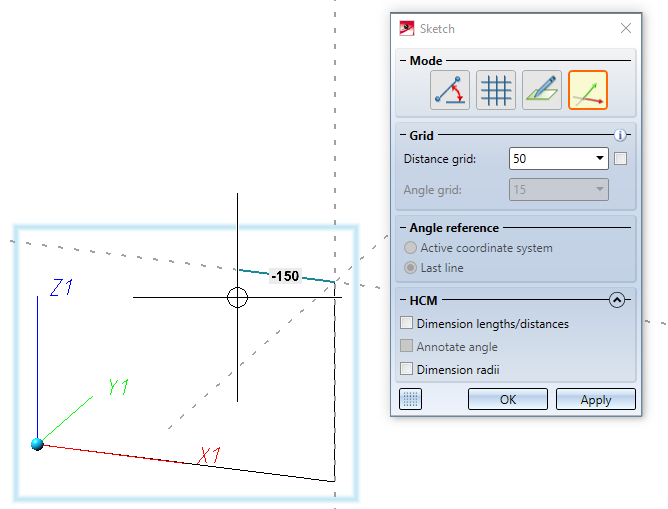 3-D sketches require a part coordinate system to which, for example, the grid during sketching or possibly assigned HCM constraints refer. In general, when creating a 3-D sketch, it is necessary to specify a plane in which the sketch is to be drawn. This determines the part coordinate system of the 3-D sketch (also sketch coordinate system).